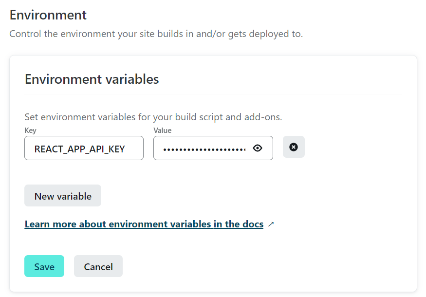 나는 이미 배포했기 때문에 Site settings > Build & deploy > Environment > Environment variables 에서 추가해주었다.